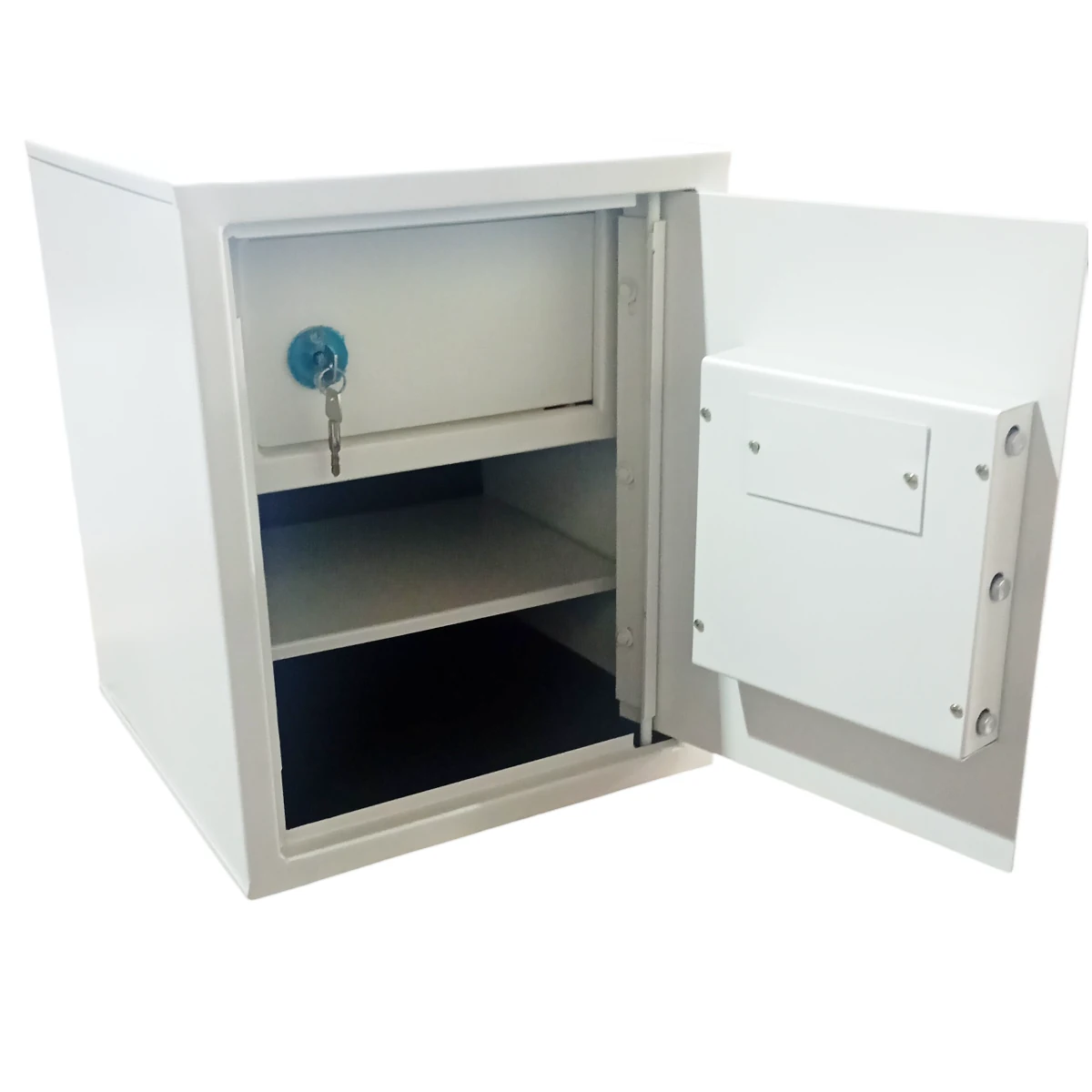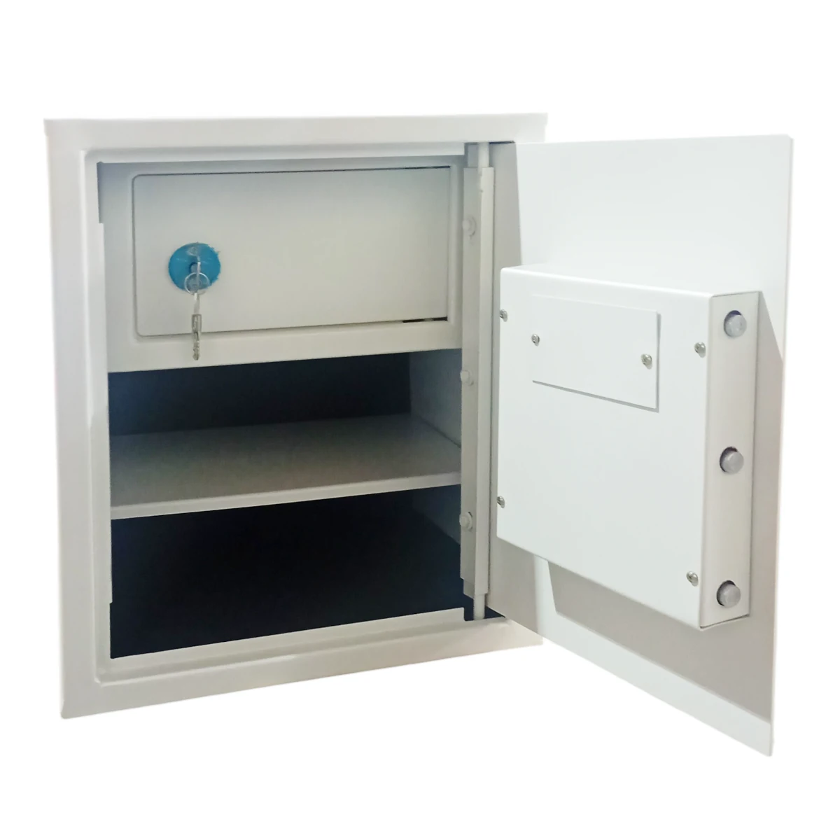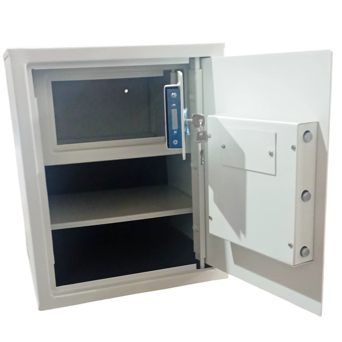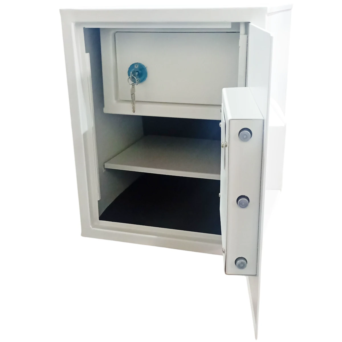 Este cofre é ideal para armazenar com segurança bastante volume de documentos, valores ou objetos. Com 50cm de altura, este cofre possui prateleira interna e compartimento fechado com chave tetra.